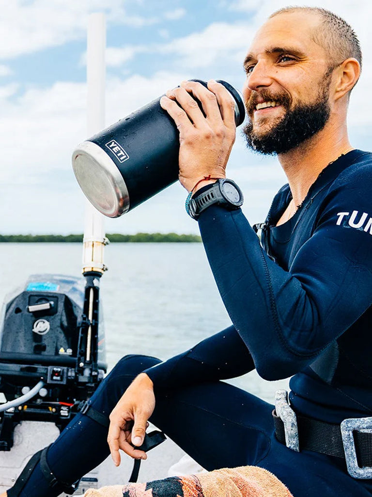 The 64 oz (1.89L) YETI Rambler Bottle is the perfect addition to your blind, ranch, or boat, with enough power to keep your water cold until the very last drop. The bottle features a durable 18/8 stainless steel construction with a No Sweat Design to keep condensation from collecting. And it's BPA-free. In other words, this is the only insulated stainless steel bottle for cold beverages that are built for the wild.