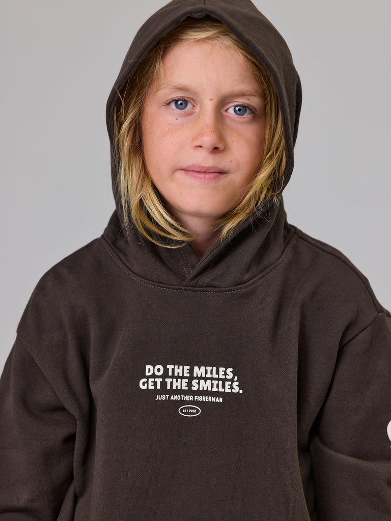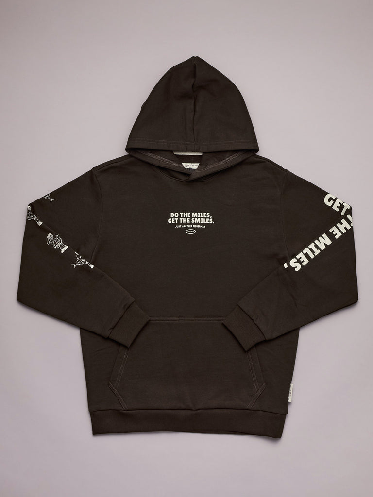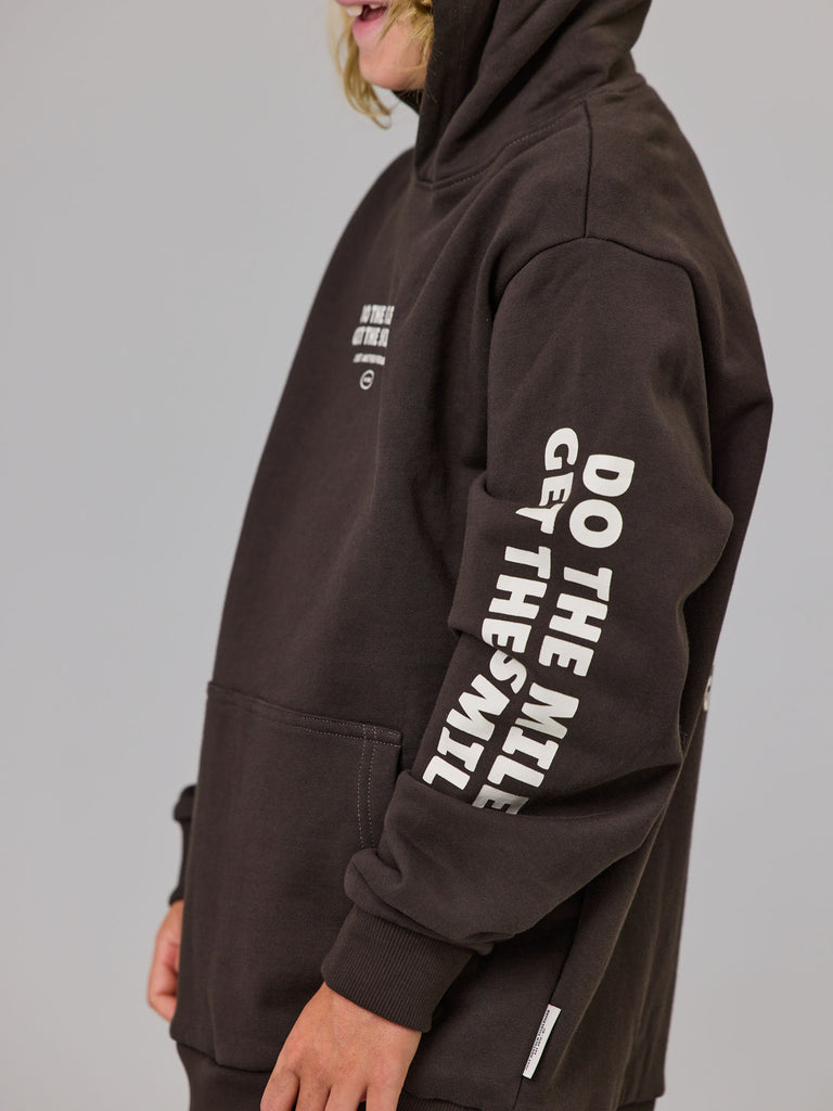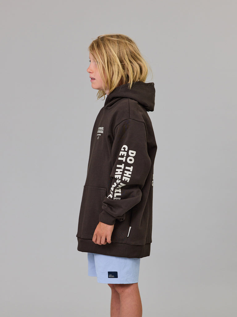 The Mini Do The Miles Hood is a classic heavy weight boxy hoodie. Featuring a front kangaroo pocket with a custom chest, back and sleeves prints. An essential garment for the colder evenings.