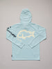 Designed for both comfort and performance, this is all your kids need to find the ultimate catch whilst being sun smart. Featuring a custom chest, sleeve and back print with a kangaroo pouch front pocket. Reel in a great day on the water with this hood!