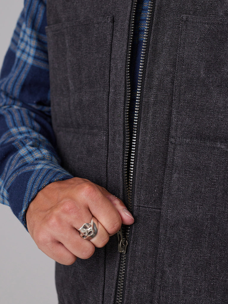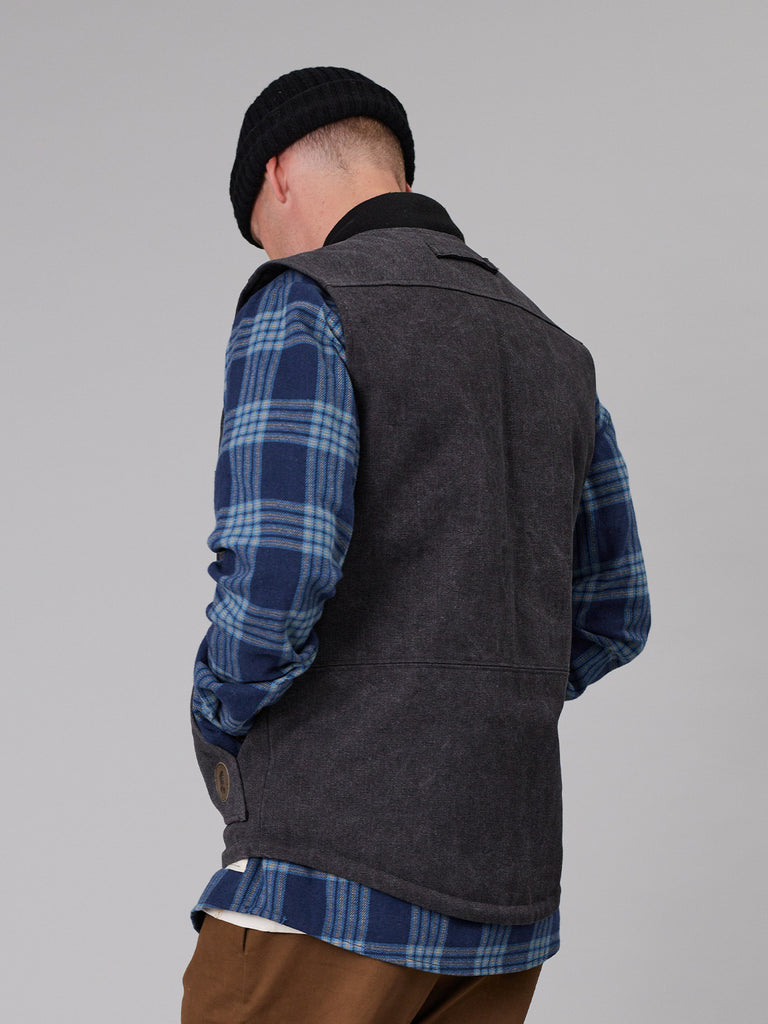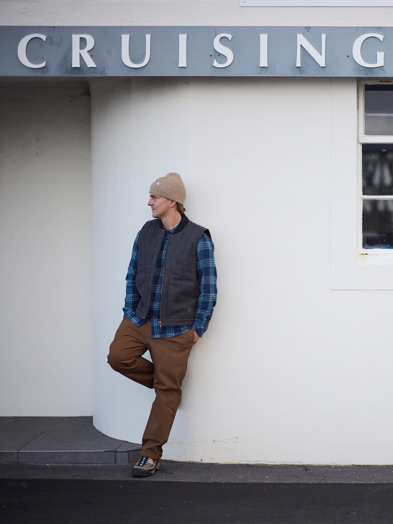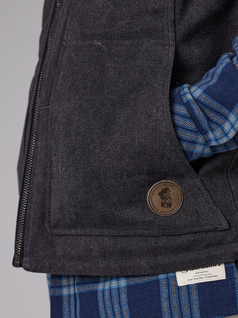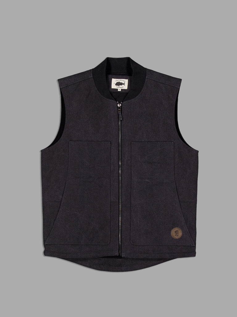 Combat the cold conditions of the sea with the Ocean Works Vest. A Layer-over-everything style that'll work with just about anything. A quality wax coated canvas outer and poly-filled vest, featuring a grunty metal zip, quilted lining and leather pocket patch.