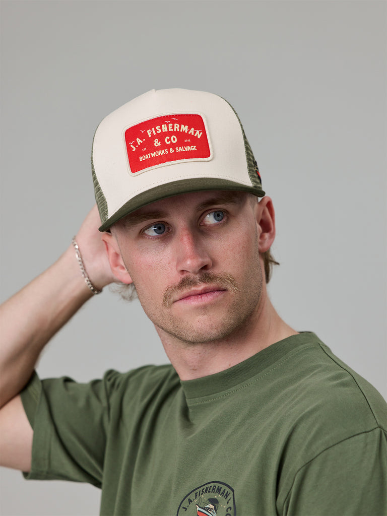 Built for sun, salt, and long days out. The Salvage Lorry Cap is a high-profile trucker with breathable mesh and bold front patch branding.